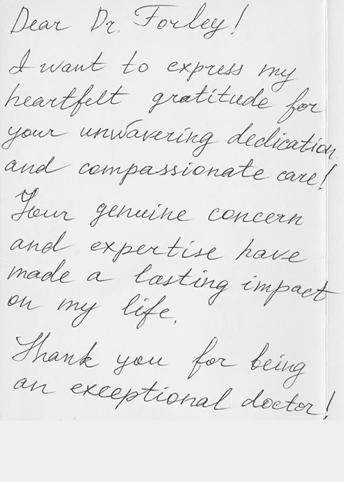 INCREDIBLE in every way is how I describe Dr. Forley! From your first appointment you will know you have found a doctor who advises, guides and gives you such wonderful care all along the way.